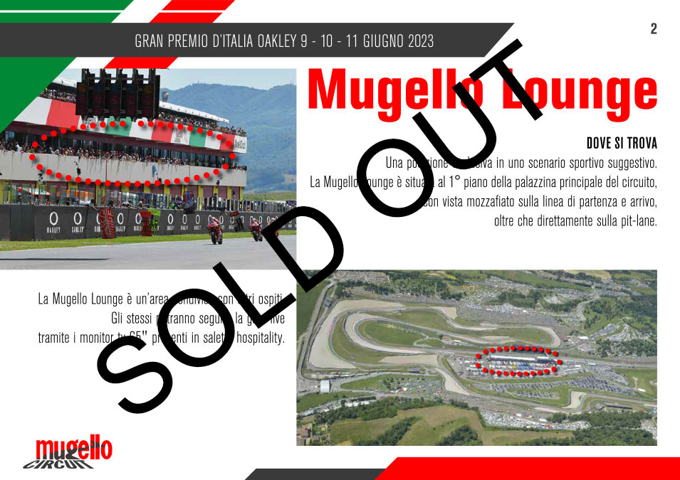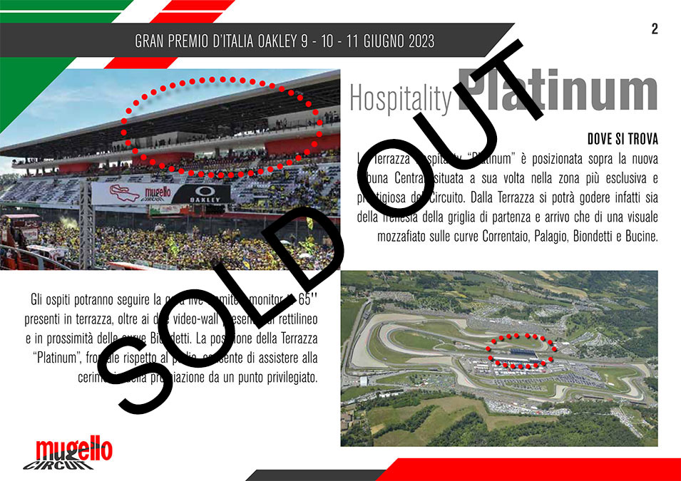 Esclusive, panoramiche, le VIP HOSPITALITY GOLD E PLATINUM situate nella terrazza sopra la tribuna Centrale, vantano la visuale più esclusiva del tracciato del Mugello: dalla pit-lane e la griglia di partenza, alla prima curva la staccata mozzafiato della San Donato e poi via sui saliscendi toscani. La terrazza permette di seguire la corsa in diretta su gran parte delle curve oltre ai monitor e il maxischermo dedicato.