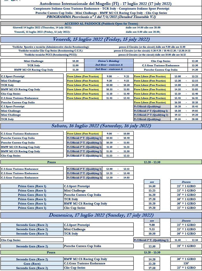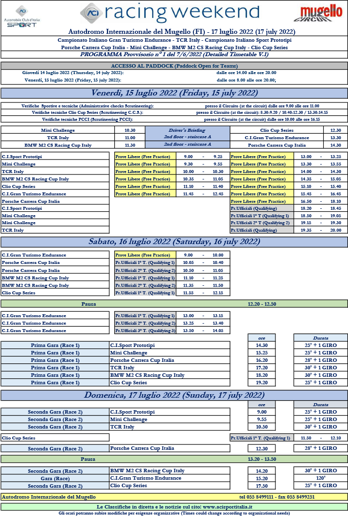 Al Mugello World Circuit il 6° ACI Racing Weekend della stagione 2022! Sulle 15 tecniche e impegnative curve del circuito a Scarperia si alterneranno in pista i duelli delle supercar del Campionato Italiano Gran Turismo Endurance, in una emozionante 2 ore di gara senza esclusione di colpi. Poi ancora le vetture TCR tricolore daranno spettacolo in due gare; doppia battaglia in pista anche per le scattanti Wolf GB08 Thunder del Campionato Italiano Sport Prototipi. Nel weekend di motori targato ACI scenderanno in pista anche i Trofei di Marca dedicati a Porsche, Mini, BMW e Clio, in un evento da non perdere per tutti gli appassionati dello sport a 4 ruote.